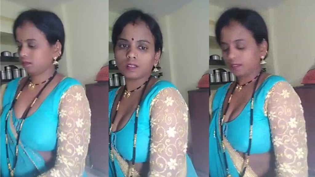Mallh bhabhi showcasing popup blouse in blue saree on video chat with stranger.